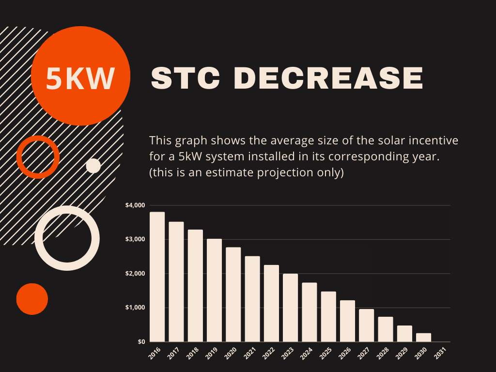 The number of those certificates issued, depend on the size and number of panels included in your system. On the 1st of January every year the number of STCs issued per system size decrease. The graph below illustrates this decrease as an example.
